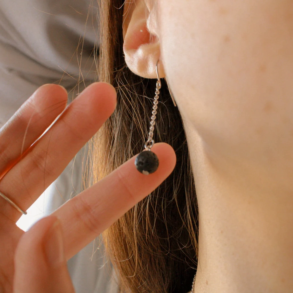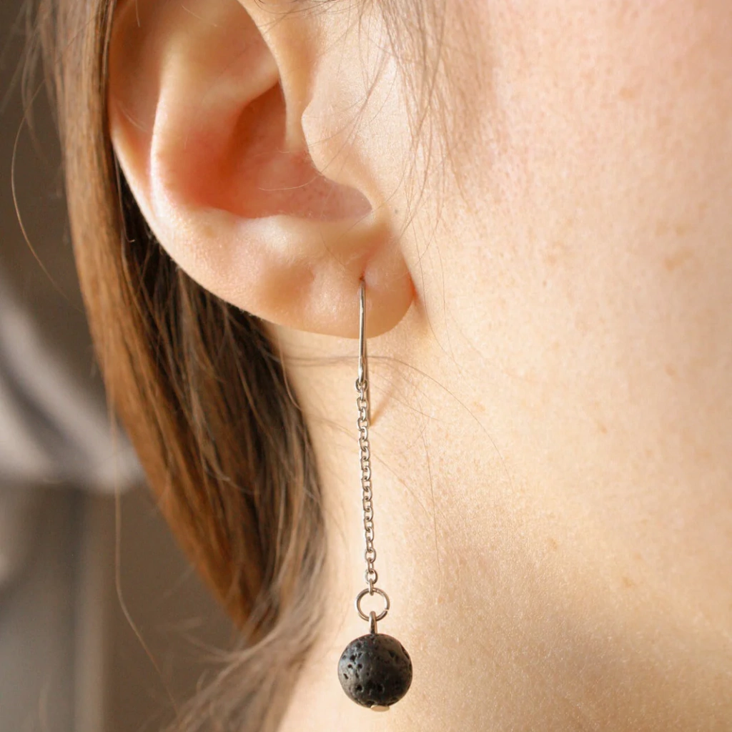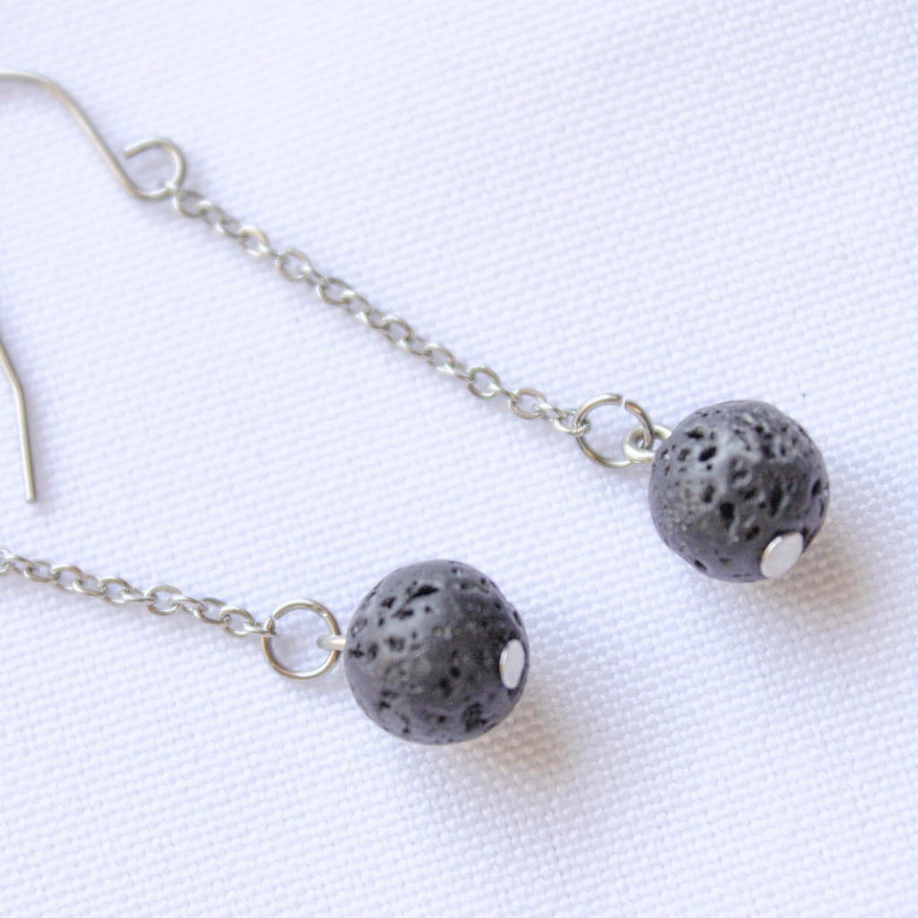 Hechos con bolitas de piedra volcanica,pasantes de acero quirúrgico. Largo 5 cm