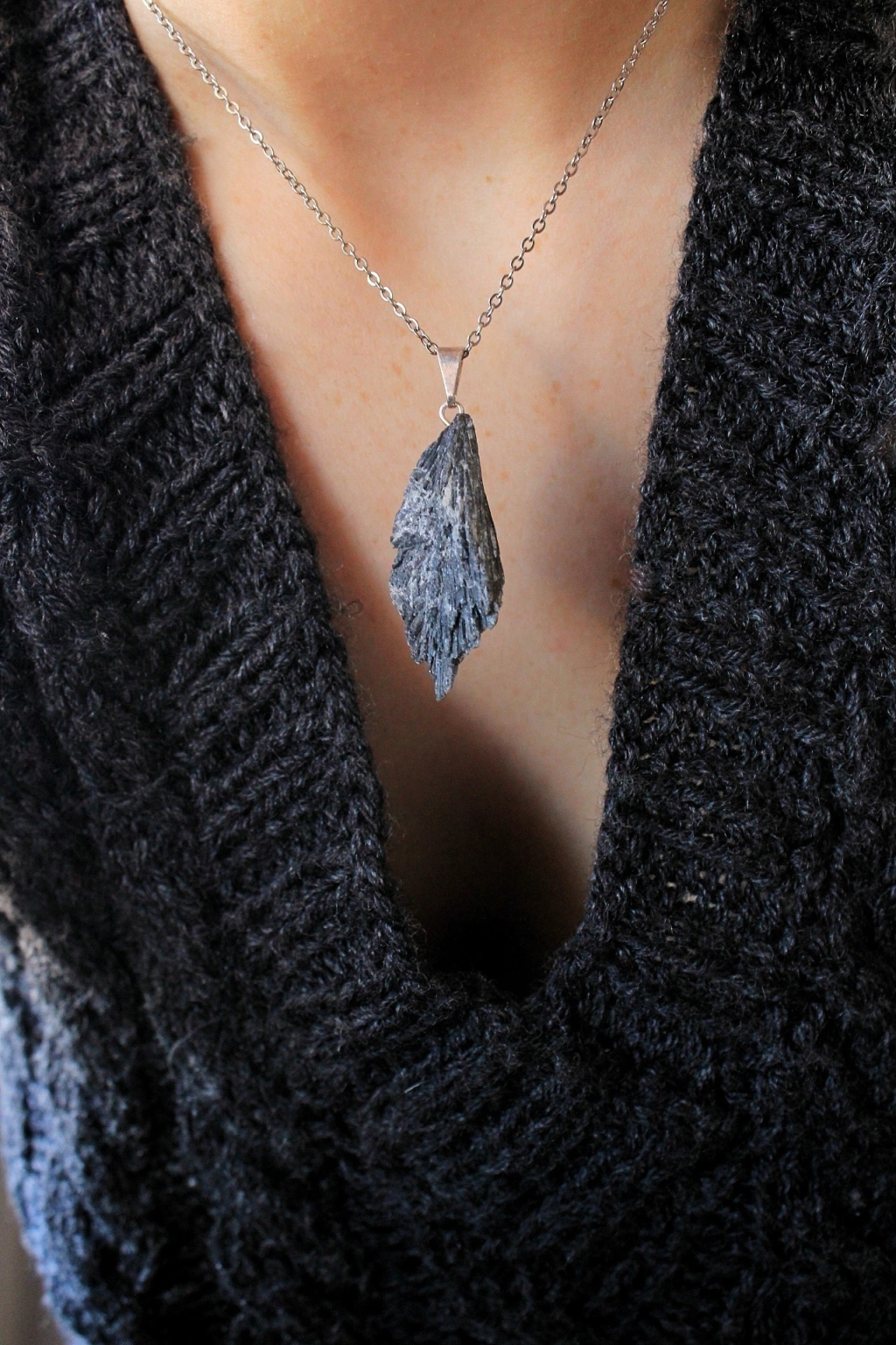 Collar hecho con dije de Cianita Negra o también conocida como escoba de bruja y cadena de acero quirurgico 45 cm