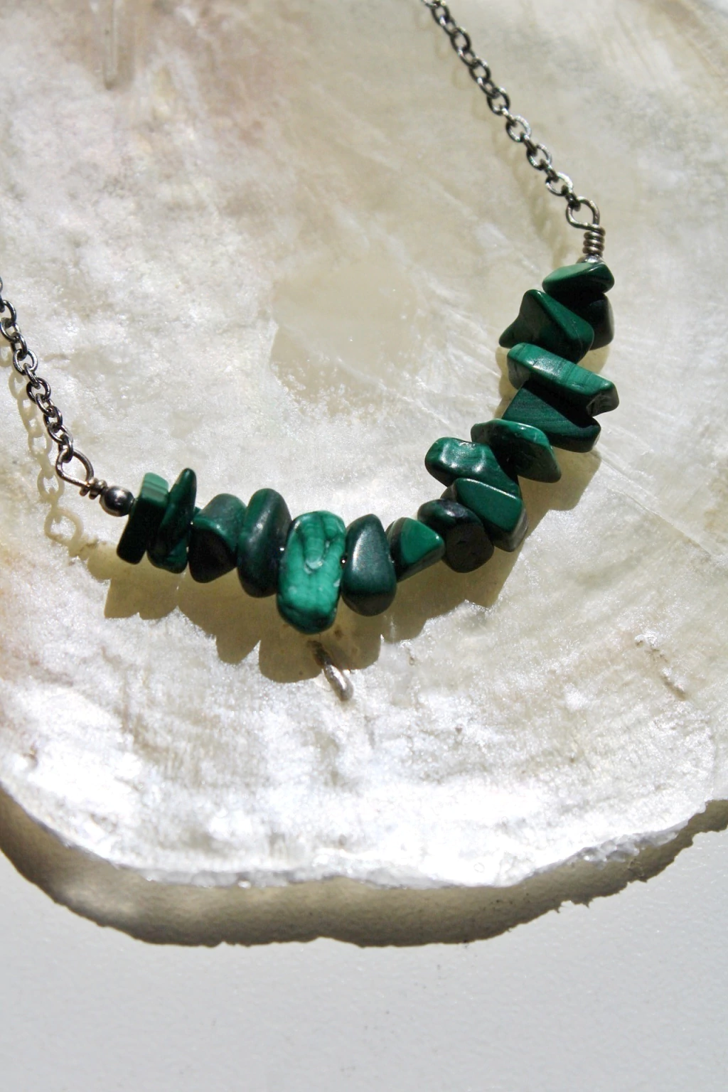 Hecho a mano por cristales de Malaquita, bolitas de acero quirúrgico y cadena de acero quirurgico.