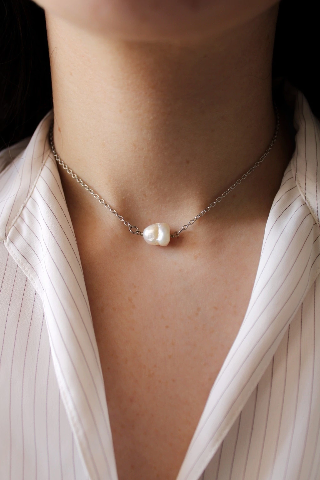 Cada gargantilla fue hecha a mano con perlas cultivadas, cadena de acero quirurgico y alambre de alpaca