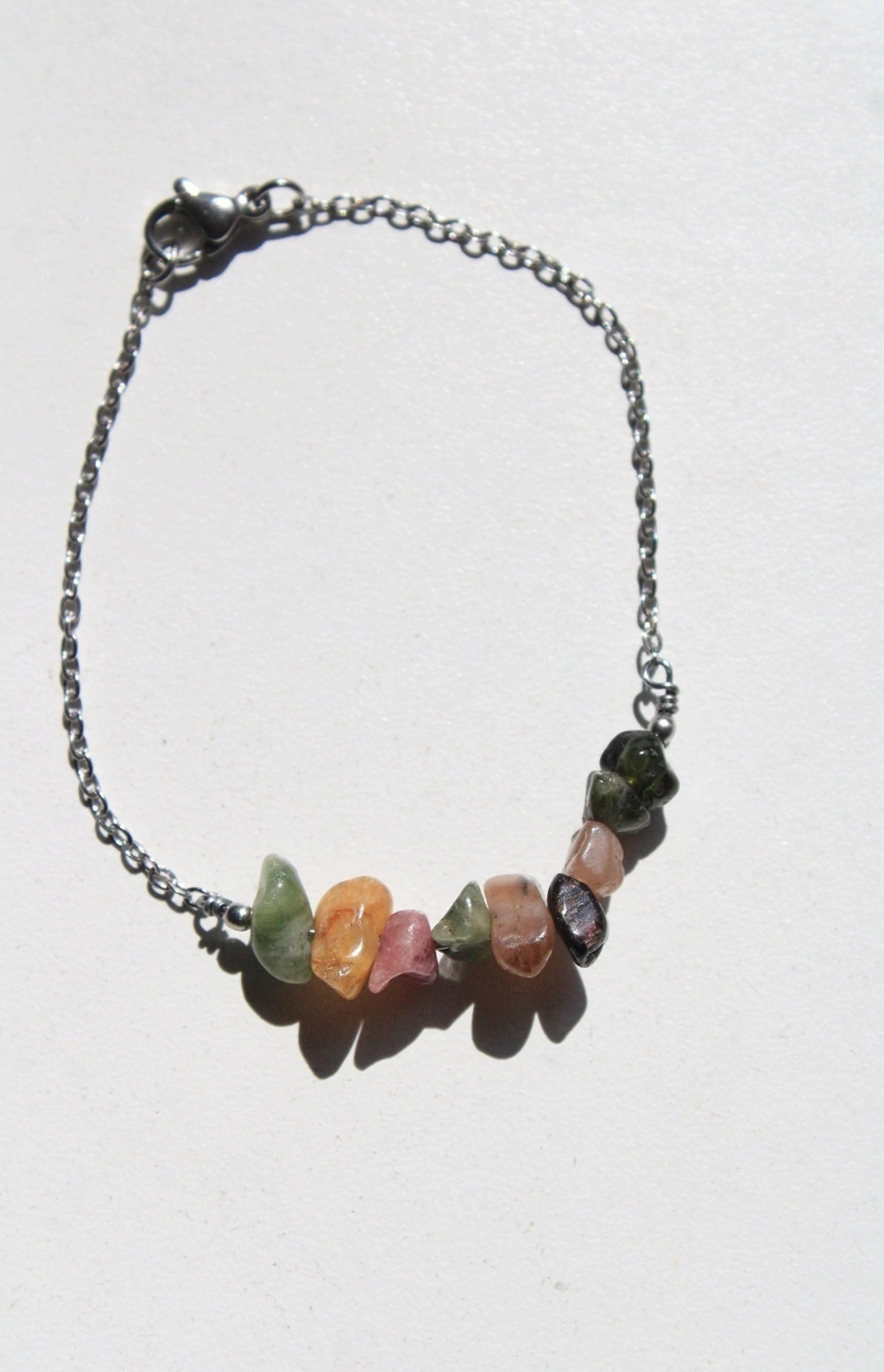 Pulsera hecha con escallas de diferentes turmalinas hecha de acero quirurgico. Mide 17 cm + 3 cm de extensón. Si la queres mas pequeña deja el largo en notas del cliente y se hará del largo que necesites